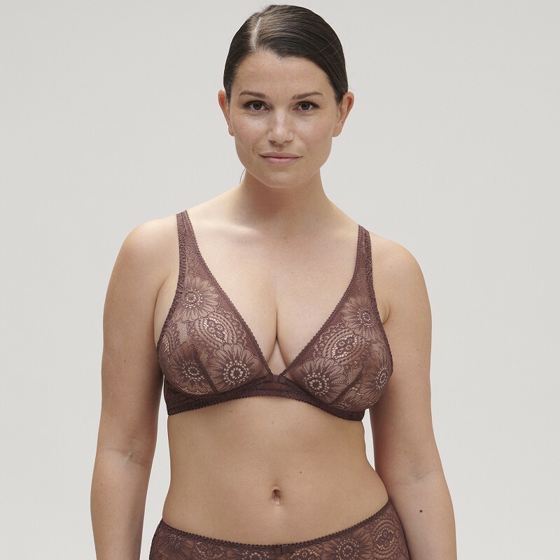 三角罩杯無鋼圈胸罩,採用再生黎芭蕾絲與再生薄紗面料製成