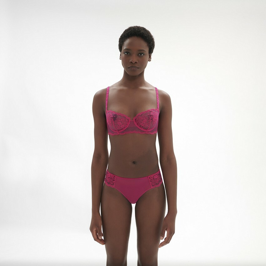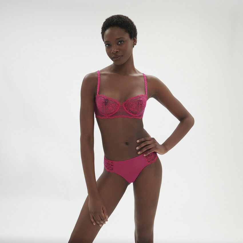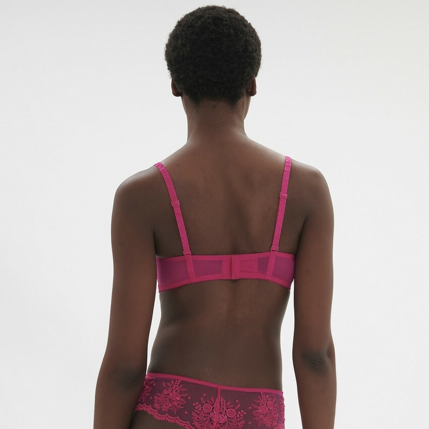 刺繡面料罩杯,搭配垂直褶線剪裁,胸型更立體