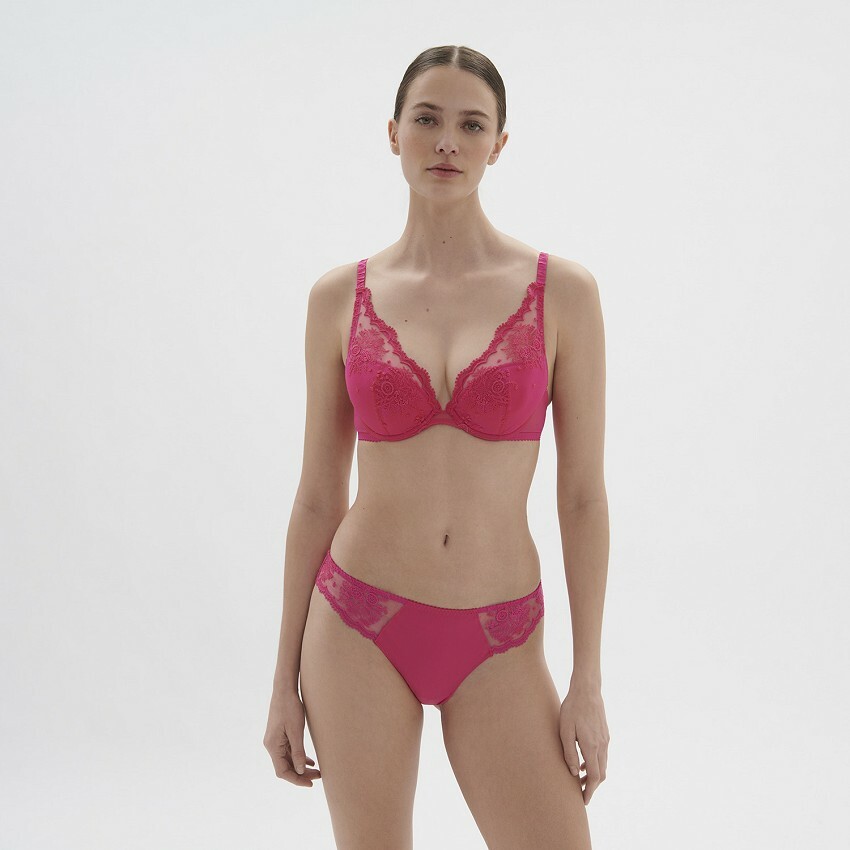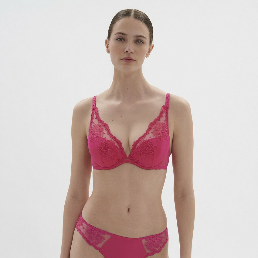 刺繡面料罩杯,搭配垂直褶線剪裁,胸型更立體