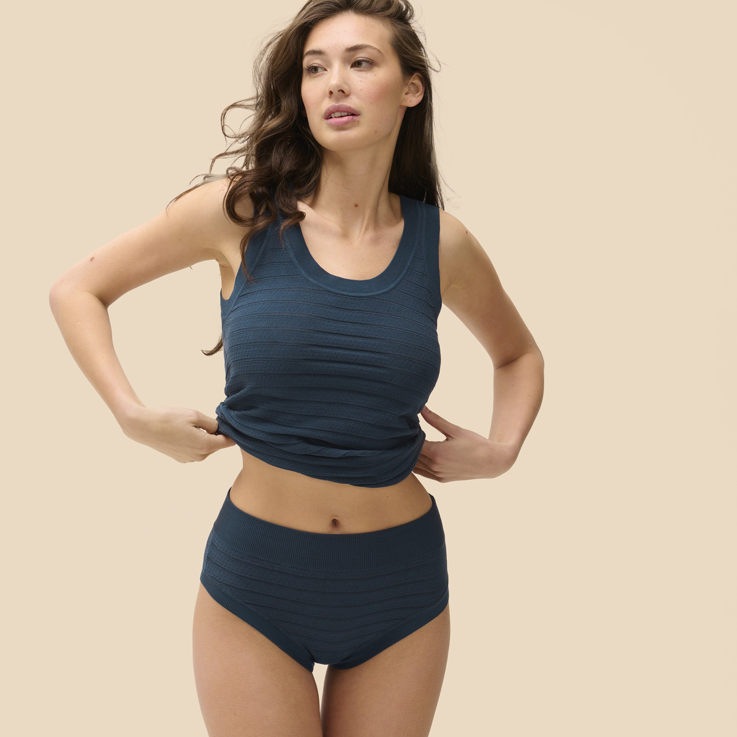 輕柔親膚且貼合身形,展現自然曲線。 鏤空織紋增添優雅氣息,SIMONE CARES 永續系列,兼具美感與環保。