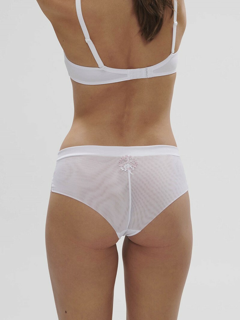 刺繡細節托襯背面,並以褶襇的薄紗打造無痕效果